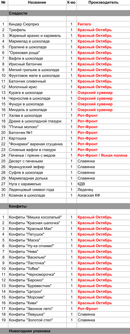 Трюфель (1 шт), Жареный арахис и карамель (1 шт), Мармелад в шоколаде (1 шт), Пралине в шоколаде (1 шт), "Ореховая роща" (1 шт), Вафли в шоколаде (1 шт), Ирисный батончик (1 шт), Мягкий грильяж в шоколаде (1 шт), Фруктовое желе в шоколаде (1 шт), Батончик сливочный (1 шт), Молочный ирис (1 шт), Конфеты "Мишка косолапый" (1 шт), Конфеты "Красная шапочка" (1 шт), Конфеты "Красный Мак" (1 шт), Конфеты "Петушок" (1 шт), Конфеты "Маска" (1 шт), Конфеты "Ну-ка отними!" (1 шт), Конфеты "Нива" (1 шт), Конфеты "Васильки" (1 шт), Конфеты "Ласточка" (1 шт), Конфеты "Toffee" (1 шт), Конфеты "Черноморочка" (1 шт), Конфеты "Барокко" (1 шт), Конфеты "Буревестник" (1 шт), Конфеты "Цитрон" (1 шт), Конфеты "Морские" (1 шт), Конфеты "Киви" (1 шт)